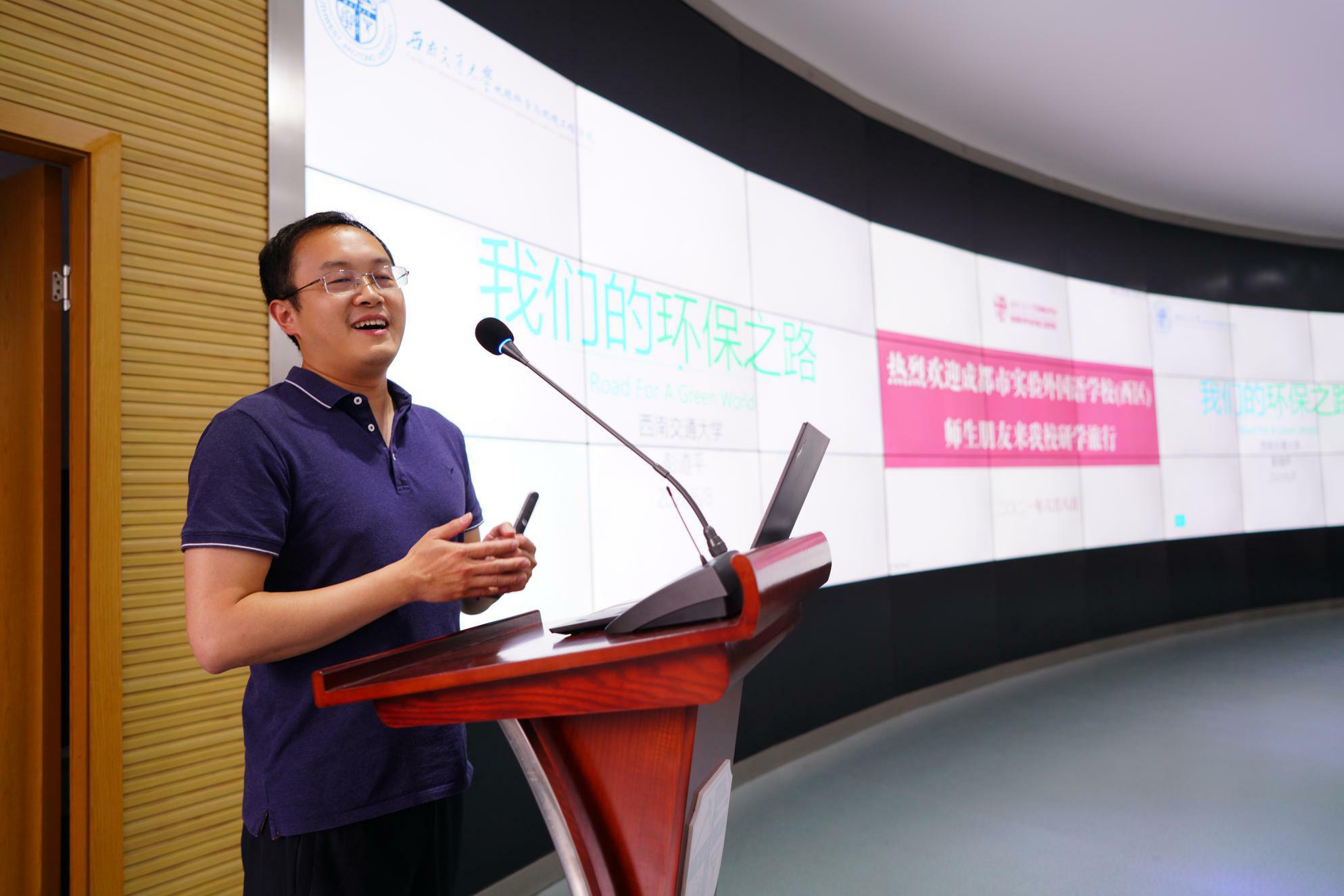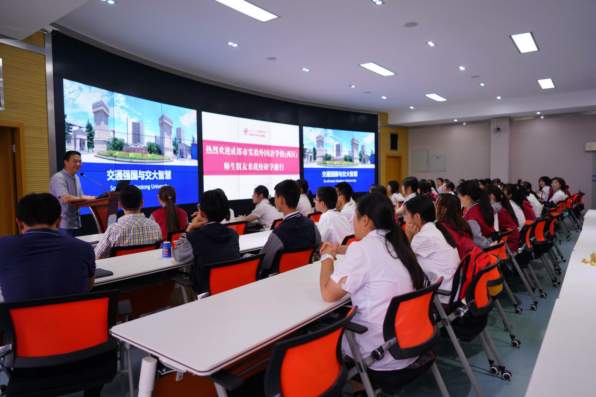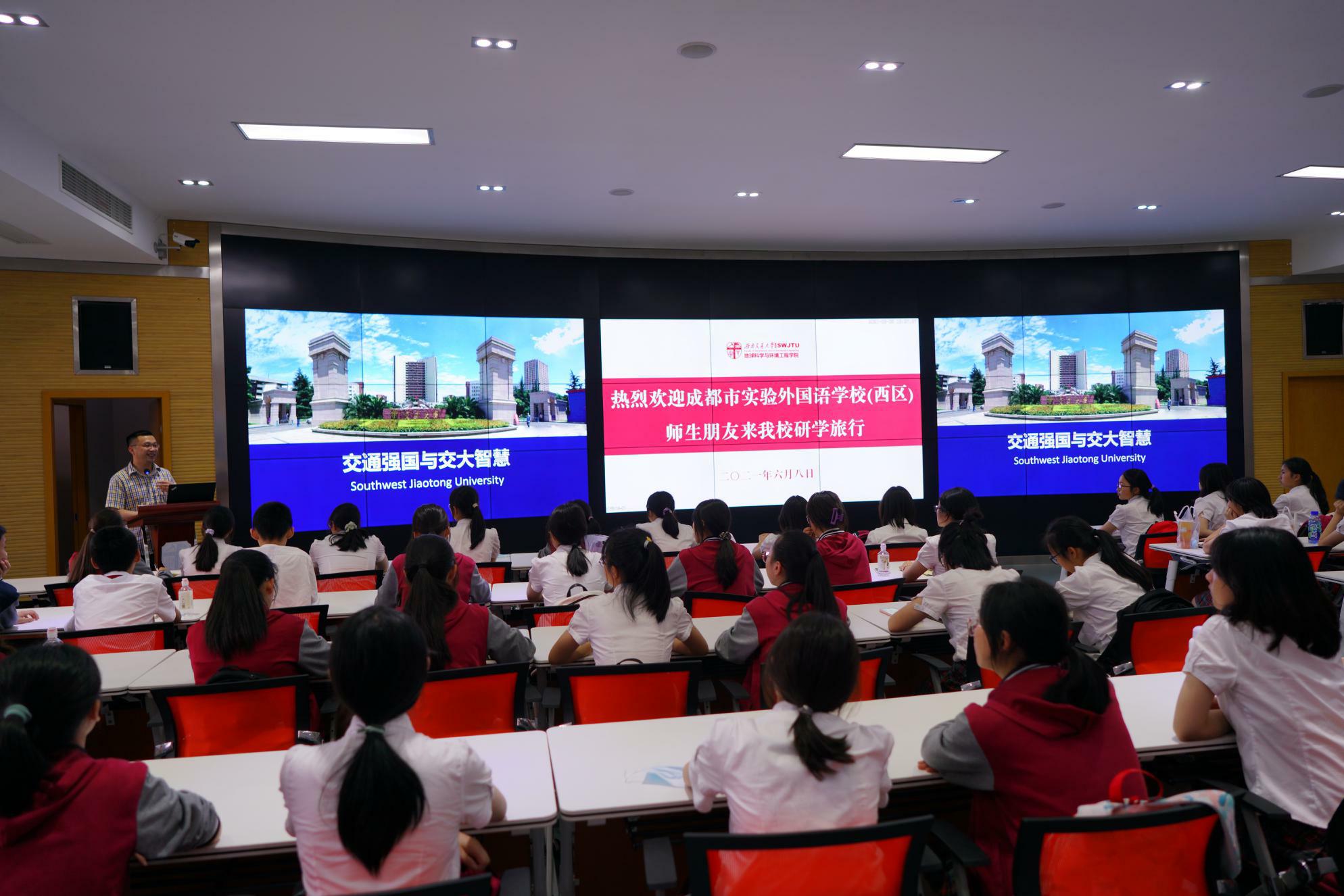 领导热情接待了成实外的师生并为同学们准备了内容丰富的讲座。关秦川介绍了交大办学目标、校内人文景观,列举了我校部分杰出校友在轨道、高铁方面做出的巨大贡献和成绩,表达了对同学们践行“竢实扬华”的殷切期待。傅尤刚表示,交通驱动要素流动、拉动关联产业协同、促进经济发展,交通强国是世界强国的显著特征,而交大在交通方面更是遥遥领先;通过宣介交大近年招生情况,鼓励同学们努力学习,考上心仪的大学。彭道平从环保之路出发,介绍了成都市近年来在环境保护方面的项目,为同学们展示了各种生活垃圾的图片并引导其分辨,现场气氛活跃;通过播放微塑料相关视频,让同学们更加深入了解塑料垃圾的危害,意识到环保之路依旧漫长。