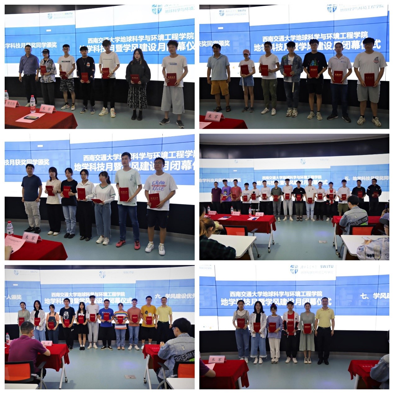 现场依次为“高校火灾评估调查及解决方案大赛”“地质专业大赛”“环境保护降噪大赛”、第十七届“中海达杯”测绘技能大赛、学风建设月优秀个人奖、学风建设月优秀宿舍的获奖同学颁奖。