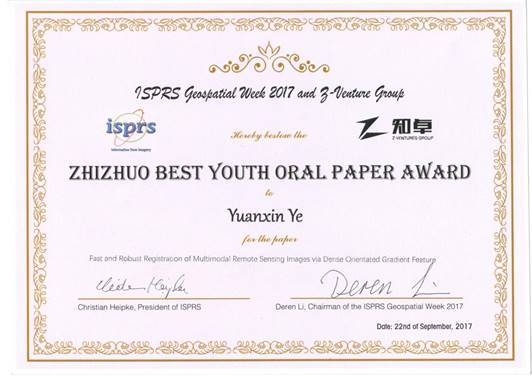 The ISPRS Geospatial Week 2017(GSW2017), which is devoted to promoting international cooperation and exchanges in surveying and mapping and the development of geospatial science and technology, have been hosted by International Society for Photogrammetry and Remote Sensing (ISPRS) and WuHan University on September 18-22, 2017 at Wuhan. The teacher of our university, Dr. Yuanxin Ye, won the best youth oral paper award of the conference.