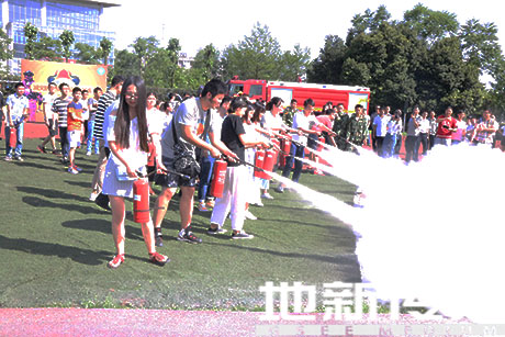 After the raid, counselors were all ready for the emergency evacuation exercise. University radio station broadcast precautions, then, at 4 p.m., alarm went off. After waiting for 10-20 seconds, students gradually evacuated to safety places. Then, firefighters from Xipu Fire Squadron showed students how to use fire extinguishers correctly.