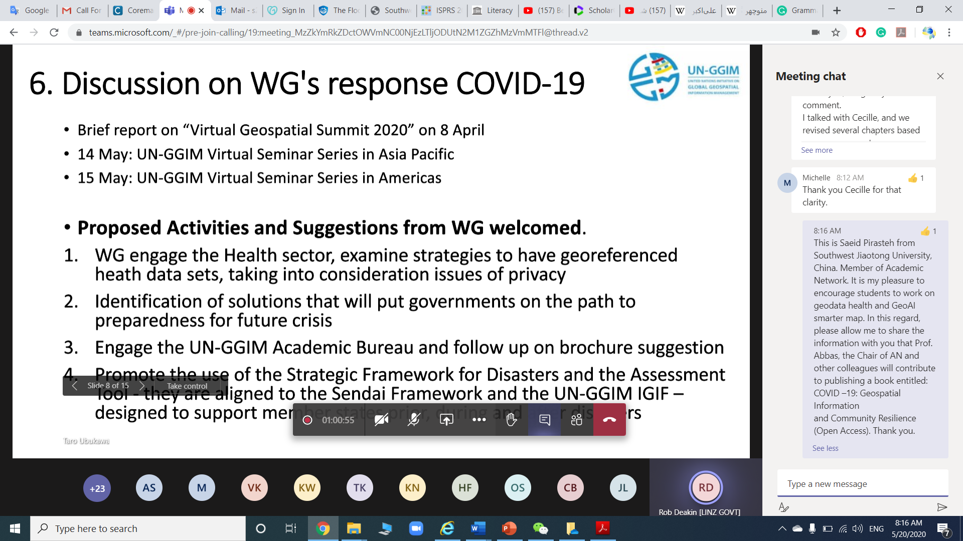 The meeting of the Working Group on Geospatial Information and Services for Disasters (WG-Disasters) was conducted on Wednesday, May 20, 2020. The meeting took more than 2 hours and discussed the tasks of groups on disasters and Strategic Framework Assessment. Saeid (Adam) Pirasteh from the Faculty of Geosciences and Environmental Engineering (FGEE) represented the Southwest Jiaotong University in this meeting. Southwest Jiaotong University (SWJTU) is a member of the Academic Network of United Nations-Global Geospatial Information Management (UN-GGIM).
