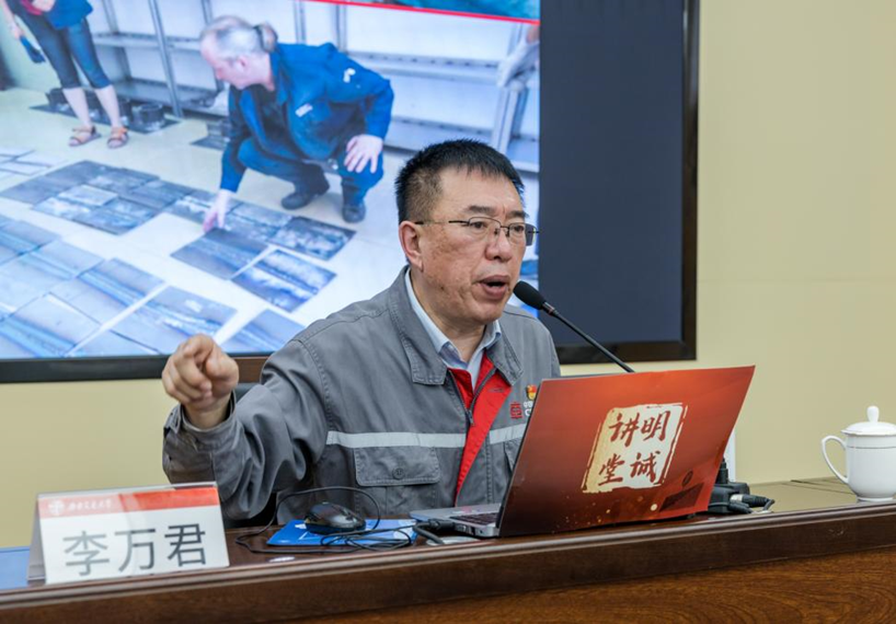 李万君同志开展题为《弘扬劳模精神 工匠精神——我的成长之路》专题报告。李万君从“树立理想 争做工匠”“无私奉献 培育工匠”“敢于担当 勇于创新”“忠诚企业 报效国家”“用匠心实现中国梦、高铁梦、个人梦”等五个方面,结合自身经历,用轻松诙谐的语言讲述每个成就背后的故事,生动形象地讲述出劳模精神、工匠精神的科学内涵,告诫大家要有精益求精的工匠精神,踏实致远,不断攻坚克难,走出精彩人生。