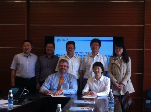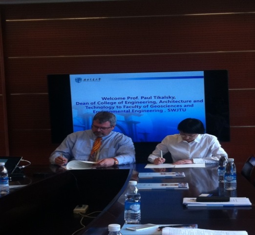 On May 17, 2016, Xiaoru Wang (president assistant) hosted a negotiation meeting to settle down SWJTU-OSU undergraduate program at X4531. Paul Tikalsky (President of Engineering, Architecture and Technology, OSU), Jiuwen Jiang (director of Office of International Cooperation and Exchanges), Weiping Xu (deputy director of Office of International Cooperation and Exchanges), Guoxiang Liu (vice president of Graduate School, president of Faculty of Geosciences and Environmental Engineering, SWJTU),Meikun Fan (president assistant), Peng Lin (associate professor of Fire Protection Engineering) and Jing Li (lecturer of School of Foreign Languages, SWJTU) attended this meeting.