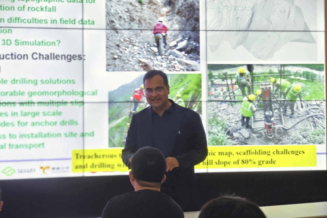 讲座伊始,Ranjan教授为我们介绍了喜马拉雅山区存在的崩塌、滑坡等地质灾害问题,并在此基础上介绍了尼泊尔现行的一些落石防治措施。随后,Ranjan教授以尼泊尔境内崩塌灾害研究工作为例,详细讲解了数值模拟方法在崩塌灾害预测研究中的应用,并结合野外崩塌落石轨迹实验研究,实现了崩塌落石轨迹的有效预测;进而,提出相应防灾减灾方案及相应防灾减灾措施野外实施方案等。Ranjan教授为我们展示了全面而详实的崩塌灾害防治研究,堪称典范。Ranjan教授还指出,随着全球气候变暖,喜马拉雅山区发生地质灾害的风险还在逐渐上升,我们亟需展开更多对于相关灾害的研究,并研发更多有效的治理手段。