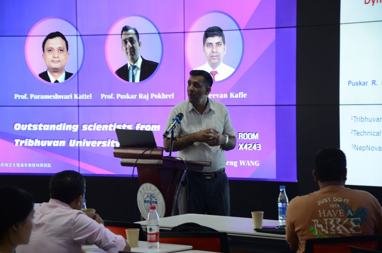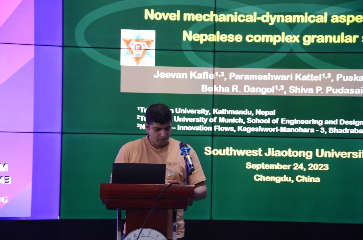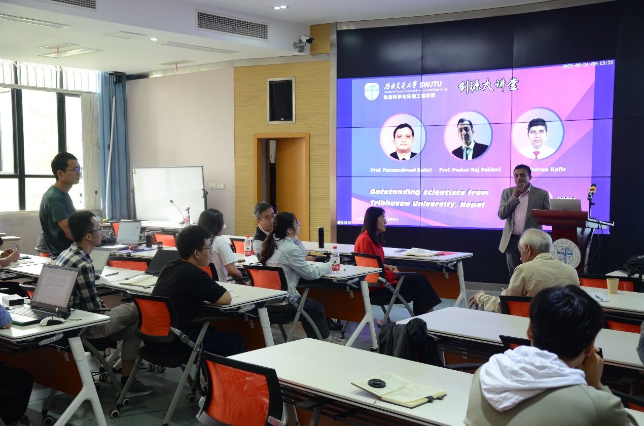 建设,开阔师生国际视野,提高师生科研能力,营造良好学术氛围,我院程谦恭教授团队特邀来自尼泊尔特里布文大学的Parameshwari Kattel、Puskar Raj Pokhrel和Jeevan Kafle三位副教授开展学术交流活动。三位学者长期从事颗粒流研究,擅长从力学和数学的角度出发,开展滑坡、泥石流等不同类型地质灾害运动演化过程研究。本次活动以线下与线上会议相结合的方式开展,累计70余人次参会。参会人员认真听取学习了3位学者的学术报告,并在会后积极与学者交流,受益匪浅。
