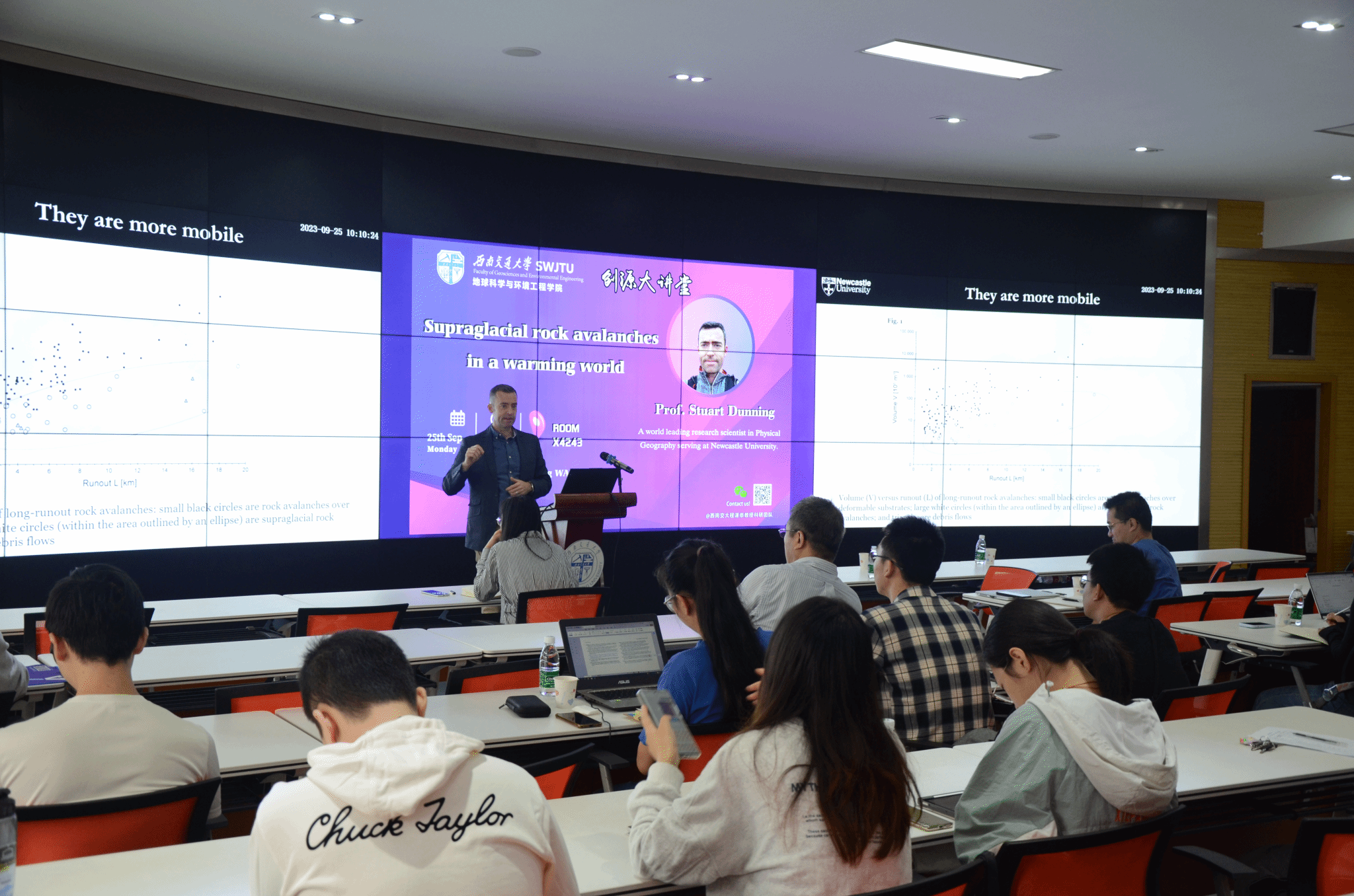 研究生和本科生的科研和创新能力,进一步营造良好的学术氛围,2023年9月25日上午,受我院程谦恭教授团队邀请,世界地质灾害领域著名学者Stuart Dunning教授来访我院,在犀浦校区X4243会议室开展学术报告。Dunning教授现任职于纽卡斯尔大学(Newcastle University),其研究涉及高速远程滑坡沉积学与动力学、冰湖溃决洪水灾害链、地貌演化与沉积物迁移等领域,并在Nature Communication、Geology、Earth and Planetary Science Letters、Landslides等国际著名期刊发表超过50篇高水平论文,在国际学术界享有盛誉。